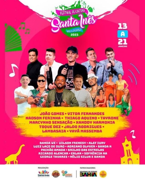 O Município de Santa Inês anunciou, através de suas redes sociais, a data para o início da edição 2023 do Festival de Cultura. O evento que é um dos maiores do interior do estado neste segmento, será realizado entre os dias 13 e 21 de janeiro e terá como tema: “Os caminhos do Vale do Jiquiriçá se encontram aqui”.