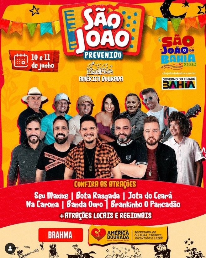 A Prefeitura de América Dourada divulgou na última semana as atrações do São João do Prevenido 2023. O evento já tradicional no distrito será realizado nos dias 10 e 11 de Junho e contará com as seguintes atrações: Gustavo Vaqueirinho, Banda Na Carona, Seu Maxixe, Brankinho Pankadão e Jota Ceará no dia 10/06. Já no dia 11/06 se apresentam Gabriel Lima, Banda Ouro, Bota Rasgada, Tarcísio de Souza e Maria dos Teclados.