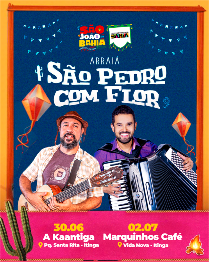 Com agendasmovimentadas no mês de junho, o cantor e músico MARQUINHOS CAFÉ e a banda A KAANTIGAtambém fizeram parteda programação do Arraiá São Pedro com Flor. Realizado no bairro de Itinga, em Lauro de Freitas/Ba, nos dias 30/06 e 02/07, respectivamente no Parque Santa Rita e na Rotatória do Arca, em Vida Nova, os eventos contaram com apoio do vereador Flor Cruz e do Governo do Estado da Bahia, através da SUFOTUR.