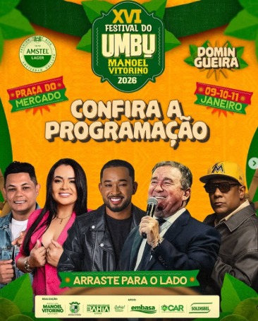 O município de Manoel Vitorino, no interior da Bahia, realizá entre os dias 9 e 11 de janeiro de 2026 a 16ª edição do Festival do Umbu. A programação acontece na Praça do Mercado e inclui apresentações musicais e o Concurso do Maior Umbu, que vai premiar o fruto com maior peso. Confira as atrações locais, regionais e nacionais, que farão parte dessa grande festa, que conta com a parceria do Superitendencia de Fomento ao Turismo