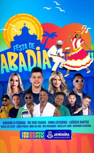 A maior e mais esperada Festa de Abadia está chegando! Em 2026, a praça vai ficar pequena para tanta emoção. No dia 02 de fevereiro, prepare o gogó para cantar todos os sucessos com o fenômeno Nadson o Ferinha, a rainha Anna Catarina e a energia de Dois amores, Adriano Oliveira e Bob na Voz. E não para por aí: No dia seguinte (03/02) tem muito pagode com Viola de Doze e o talento de João Paulo, Bob na Voz, Bio Marques, Laércia, Rei Dos Faixas e Wesley Love É música, é tradição, é o povo de Jandaíra celebrando com fé e alegria. Chame os amigos, a família e venha viver esses dias inesquecíveis!
