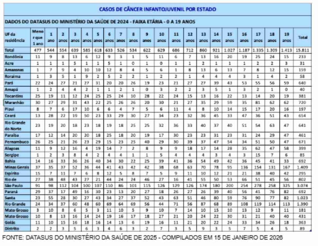 Há alguns anos, falar sobre câncer infantil não era tão comum. Hoje, infelizmente, o cenário é outro. De acordo com os dados mais recentes do Painel Oncologia Brasil (DATASUS), do Ministério da Saúde, em 2025, foram registrados quase 12 mil novos diagnósticos (11.984) de câncer em crianças e adolescentes de 0 a 19 anos no país. Em 2024, esse número foi ainda maior, com 15.811 registros. Os dados foram compilados pela SOBRASP – Sociedade Brasileira para a Qualidade do Cuidado e Segurança do Paciente – no dia 15 de janeiro de 2026.