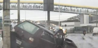 Carro bate em poste e fica destruído em Lauro de Freitas;...